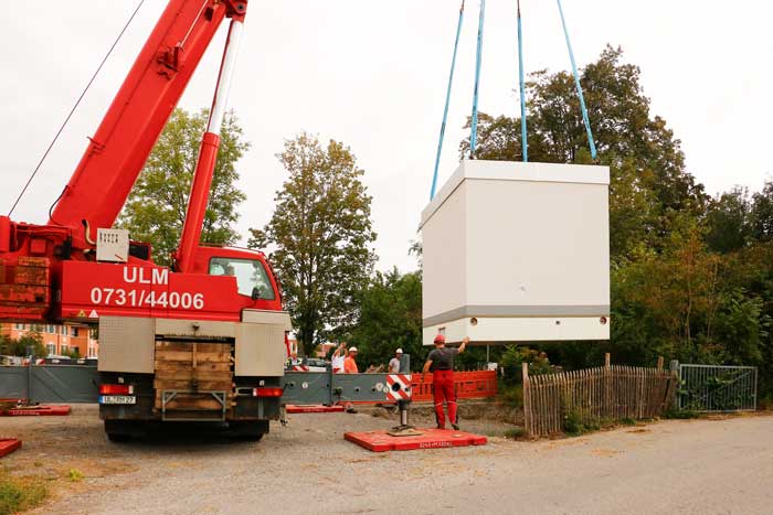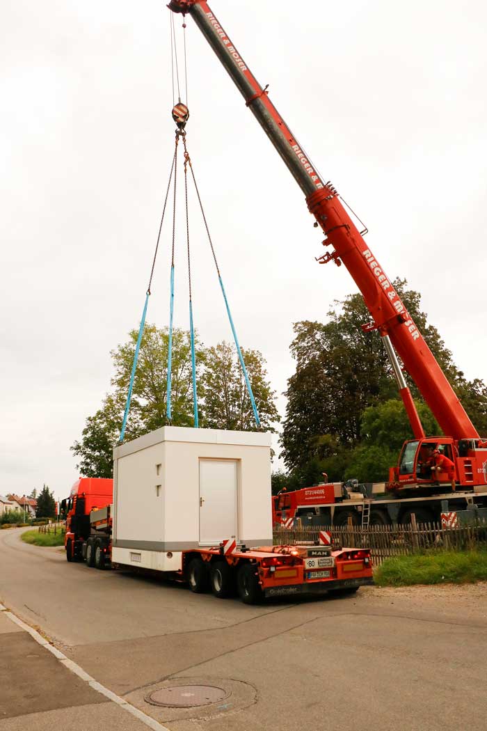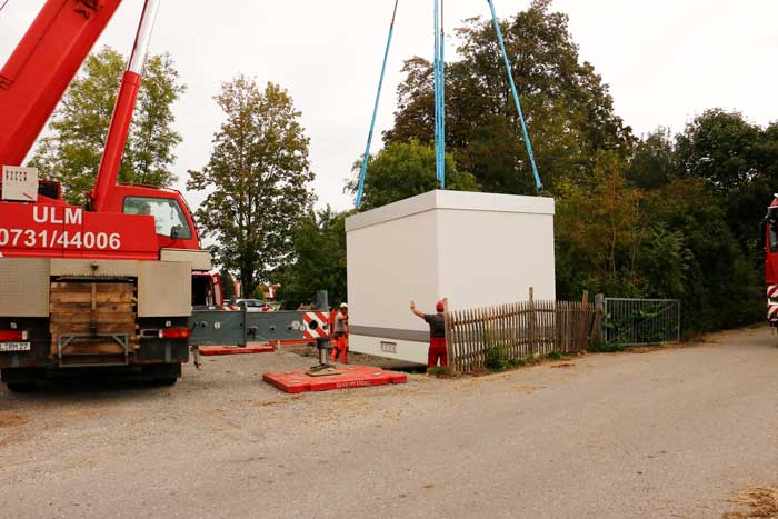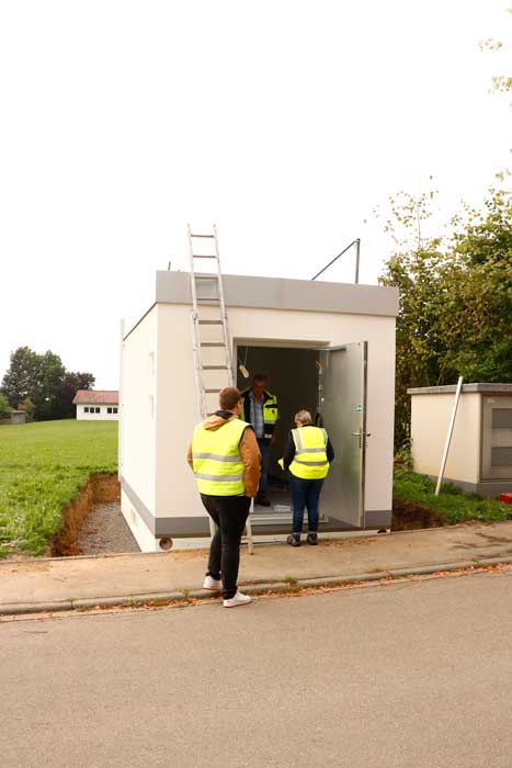 Es wurden bereits die ersten fünf von insgesamt acht PoP-Stationen angeliefert und erfolgreich aufgestellt. Die kleineren Betonstationen sind ca. 3,0 m x 3,0 m, die größen PoP-Stationen sind ca. 5,0 m x 3,0 m.